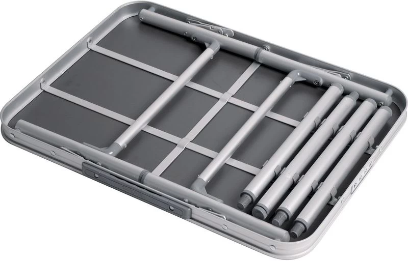 Deze campingtafel is zeer compact mee te nemen dankzij de afneembare poten. De tafelpoten en het tafelblad zijn gemaakt van lichtgewicht aluminium, waardoor de gehele tafel maar 2,4 kg weegt. Lees: twee en een halve pak suiker. Je spieren hoef je bij het optillen en verplaatsen van deze tafel niet in de strijd te gooien! Het tafelblad is gemaakt van MDF. Dit blad is niet hitte- en vochtbestendig.